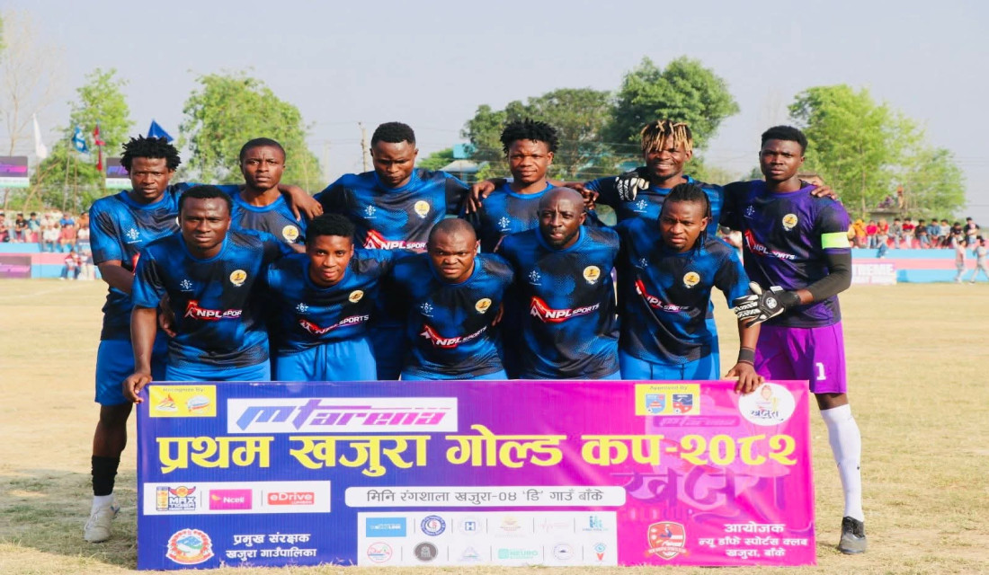 गोविन्द शर्माबाँके, वैशाख ६ गते । बाँकेको खजुरामा जारी एमटी एरिना प्रथम खजुरा गोल्डकप फुटबल प्रतियोगिताको उपाधि नाईजेरियन टोली जष्ट जोन एफसीले हात पारेको छ । खजुरा-४ डि गाउँस्थित म...