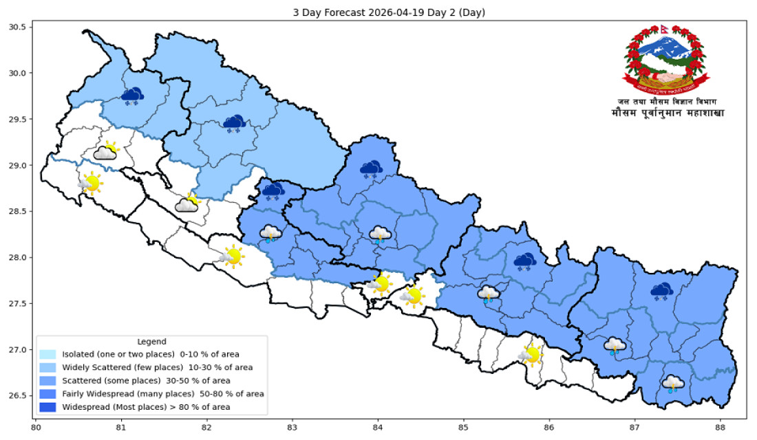 नेपालमा पश्चिमी र स्थानीय वायुको आंशिक प्रभावका कारण मौसम पूर्वानुमान महाशाखाले कोशी, बागमती, गण्डकी र लुम्बिनी प्रदेशका पहाडी तथा हिमाली भू…